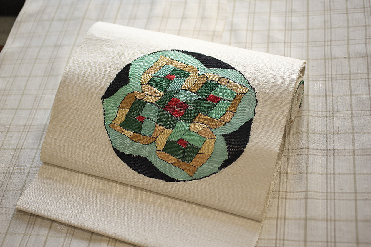 波山作品の中でも代表的なモチーフの一つで昭和初期、百貨店から依頼されてデザインした浴衣の図案を元に型を起こし帯に染めました。