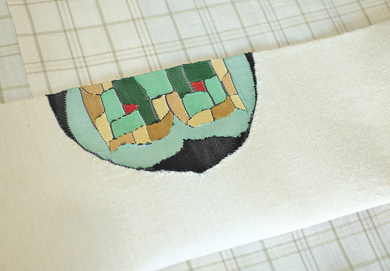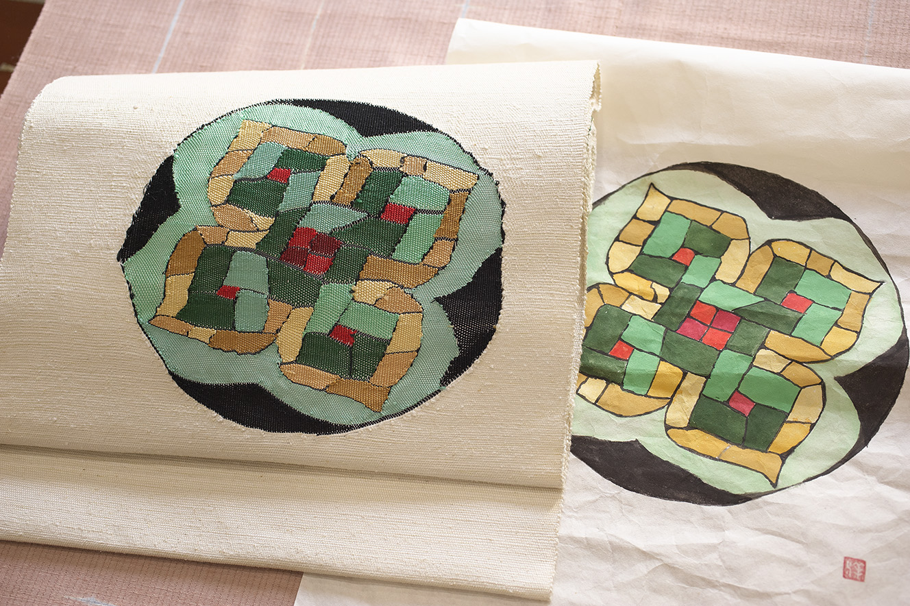 波山作品の中でも代表的なモチーフの一つで昭和初期、百貨店から依頼されてデザインした浴衣の図案を元に型を起こし帯に染めました。